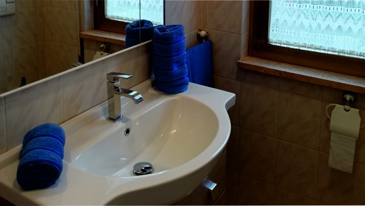 Il bagno interno moderno, con doccia, lavabo e servizi igienici.